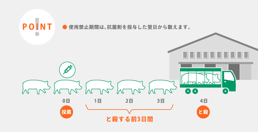 家畜に対して抗菌剤を使用する場合には特別なルールがあります。動物用医薬品に対して決められている使用禁止期間(休薬期間)です。平成18年に施行されたポジティブリスト制度によって設定された残留基準値(MRL)に基づいて設定されているもので、動物用医薬品を投与した後、屠畜するまでの間に空けなければいけない期間のことです。これは家畜の体内あるいは生産物に、薬剤の成分が残留して問題になることが無いようにと決められたものです。畜産に関わる関係者は、正しい知識を持ち、農畜産物の安全に責任を持たなければいけません。