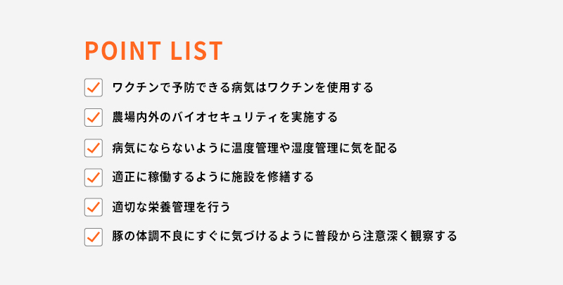 投薬の頻度を減らすために、野生動物と違って飼養管理を人間が行う飼育動物の場合には、やはり予防が重要です。つまり動物を病気にしないような衛生管理です。ワクチンで予防できる病気は予防する、外部からの新たな病原体の侵入を防ぎ農場内での病気の広がりを防ぐためのバイオセキュリティを構築し実践する、病気にならないように温度管理や湿度管理に常に気を配る、必要な施設修繕を行う、健康に飼養できるような適切な栄養管理を行う、もし体調を崩した場合にもすぐに気付けるように普段から注意深く観察してあげる、ということが挙げられます。例えば、早期に対応できれば環境管理の改善だけで快方に向かうようなケースでも、重症化するまで気付けなかった場合は治療開始のタイミングも遅れてしまい、結果的により長期間の投薬が必要になってしまうかもしれません。