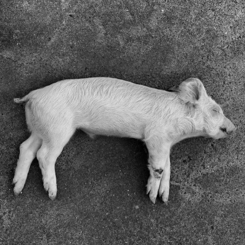 写真1:病原性大腸菌による下痢症で死亡した子豚。急激な脱水で痩せて目が窪んでいる。