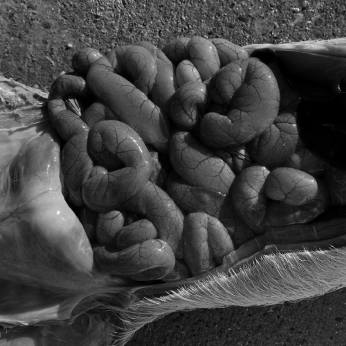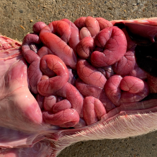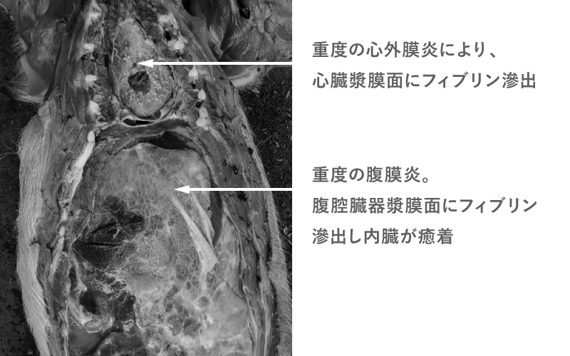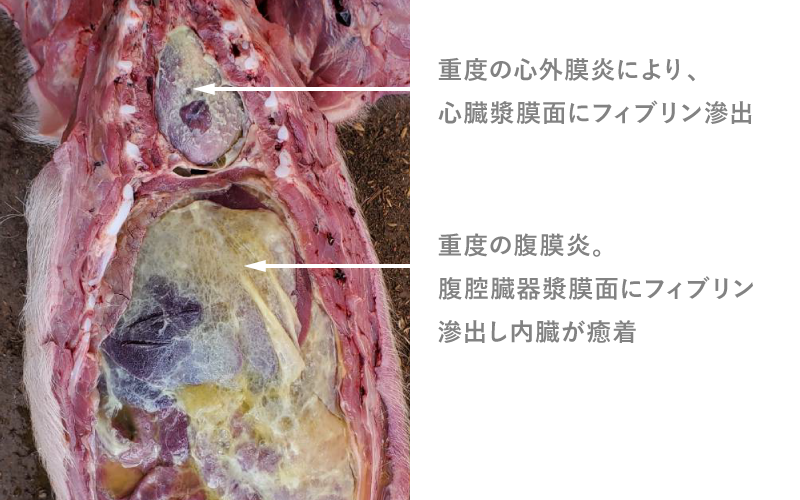 写真4:グレーサー病で削痩し死亡した子豚。重度の心外膜炎と腹膜炎が認められる