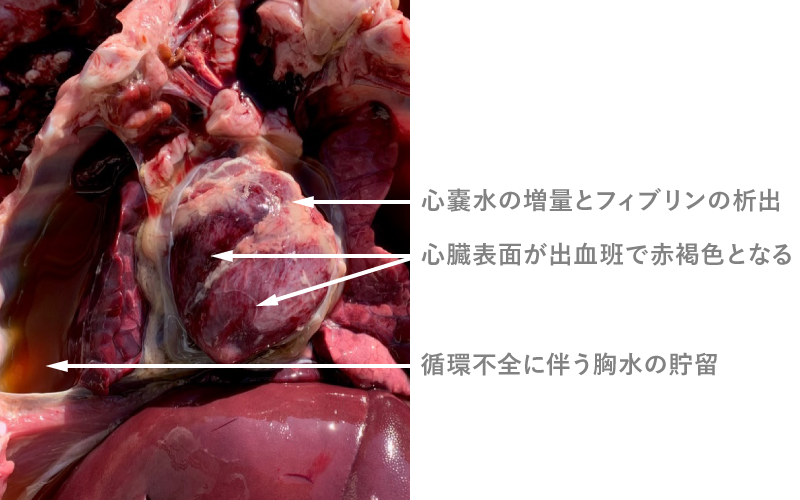 写真5:マルベリーハート病。心臓表面の出血班と心嚢水の増量とフィブリンの析出が特徴的