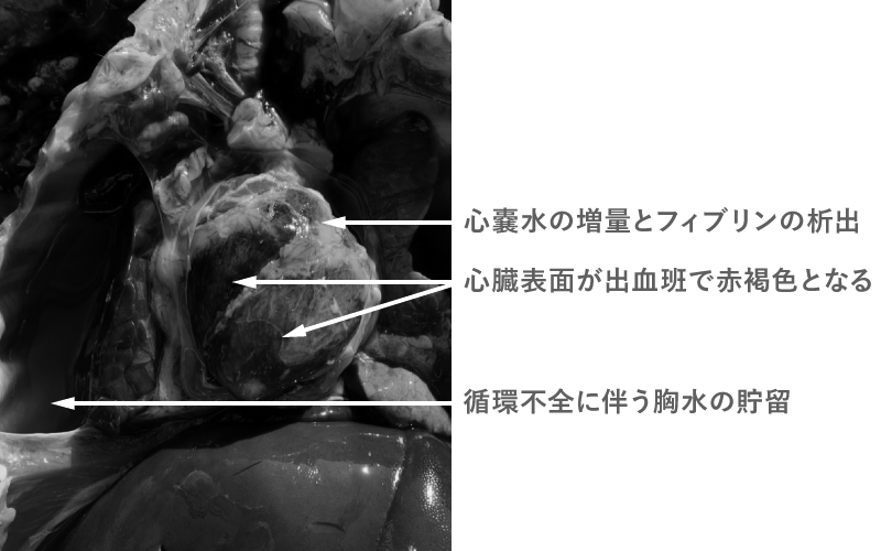 本症に罹患した子豚は発熱し、呼吸促迫や腹式二段呼吸などの呼吸器症状を呈します。死亡豚は削痩しており、心外膜炎(写真4)、胸膜炎や関節炎など多発性漿膜炎や髄膜炎を引き起こします。発症から死亡するまで時間がかかるのでグレーサー病の原因菌であるヘモフィルス・パラスイスは病巣から検出できない場合がほとんどです。そして、同居豚群に強いストレスがかかっている場合は大きな被害となります。ストレスとはすなわち環境温度の低下、飼料の嗜好性が悪く栄養価が低い、または子豚が小さいなどです。