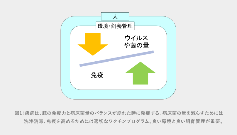 図1:疾病は、豚の免疫力と病原菌量のバランスが崩れたときに発症する。病原菌の量を減らすためには洗浄・消毒、免疫を高めるためには適切なワクチンプログラム、良い環境と良い飼養管理が重要