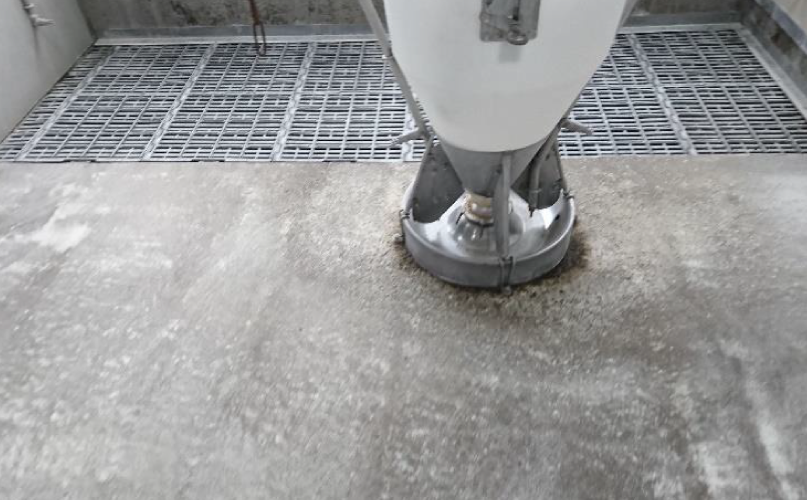 写真1:給餌器の下、給餌器周りの凸凹部分、豚房の角部分、たたきの割れ目のなかには病原体が潜むので、石灰は真っ白になるよう厚く塗布する。この状態では石灰濃度が不十分