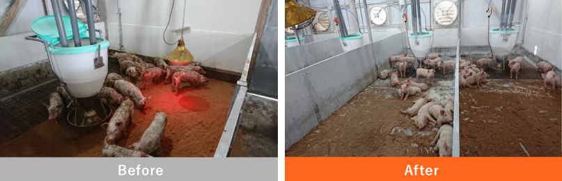 写真4:子豚が給餌器に群がり、活発な状態。子豚が快適に過ごしていることが分かる