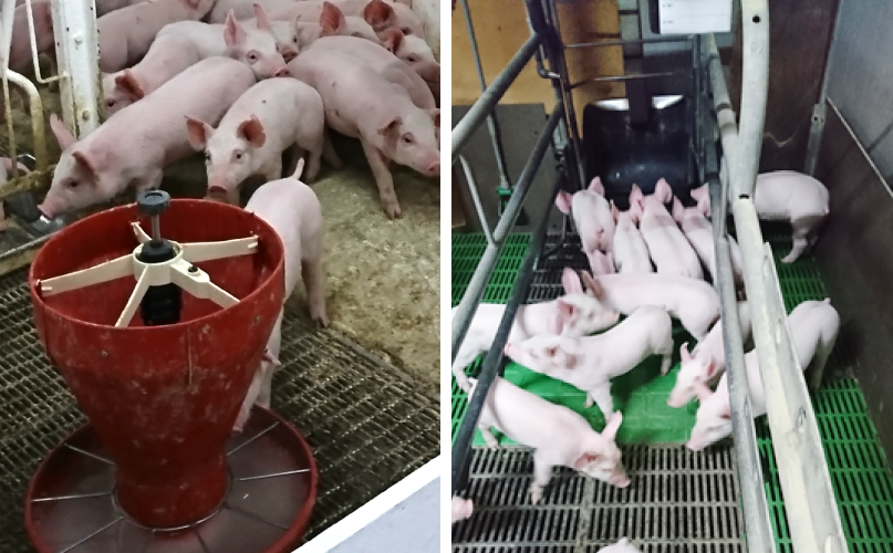 左:円形給餌器で水を提供。右:分娩舎で子豚を数日間、飼養する場合は母豚の給餌器に水をためる