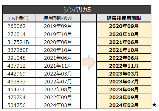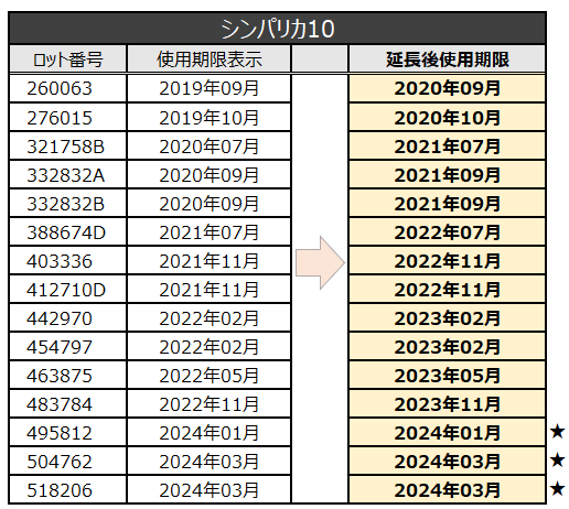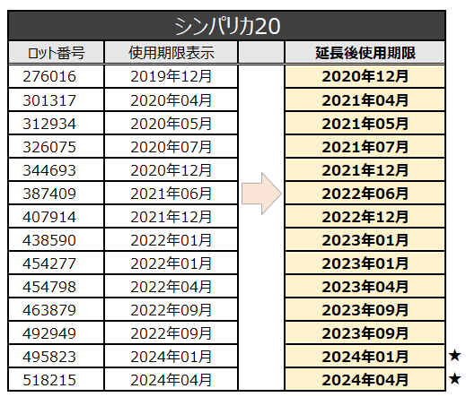 なお、新しい有効期間で印字されているロットは、上記表の右端に★印がついています。